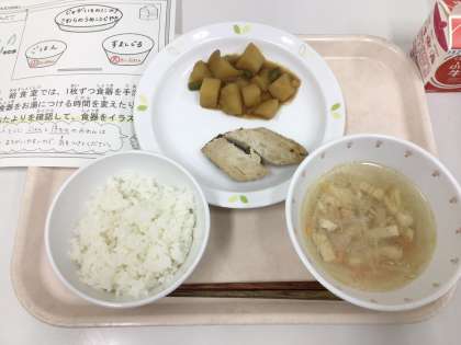 ごはん、鰆の梅麹焼き、じゃがいもの煮つけ、すまし汁、牛乳です。
