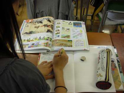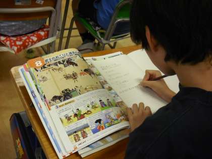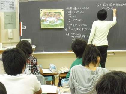 6年生の社会の授業の様子です。6年生は歴史を学習しています。教員が黒板に書いたことだけを写し書くのではなく、自分が大切だと思ったこと、必要だと思った内容は進んで書き入れていくノートづくりに取り組んでいます。