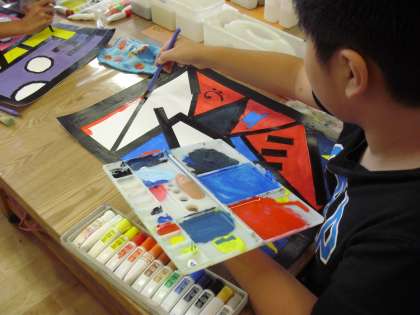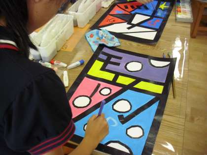 5年生の図画工作の授業の様子です。自分の名前の文字をデザインした「My name is」の制作に取り組んでいるところです。黒いガムテープの線に囲まれたところに色を丁寧に塗っています。子どもたちの創造性を働かせたデザインは、各自の工夫が光ります。