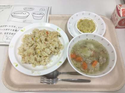 今日は、カラフルピラフ、野菜のポトフ、スイートポテト、牛乳です。
