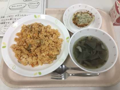 今日は、チキンライス、せん切りポテトのチーズ焼き、根菜スープ、牛乳です。