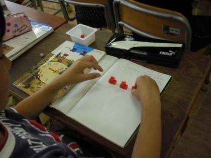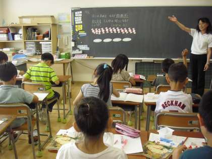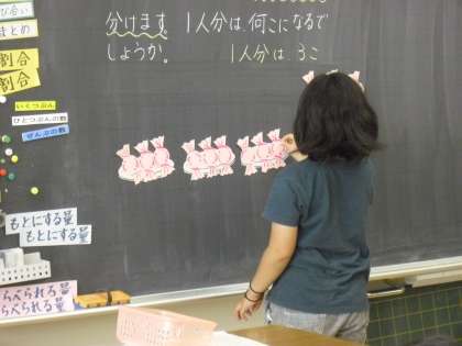 3年生の算数少人数指導の授業の様子です。わり算の学習に取り組んでいるところです。12個のキャンディを4枚のお皿に分ける問題を考えています。具体物を操作しながら考えます。このような活動が意味理解を深めていきます。