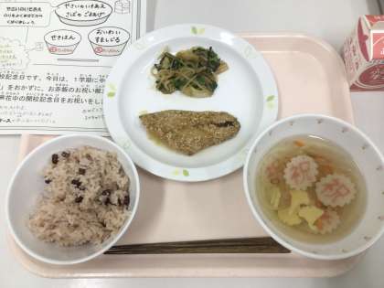 今日は、赤飯、鯖のごま揚げ、野菜の磯あえ、お祝いすまし汁、牛乳です。