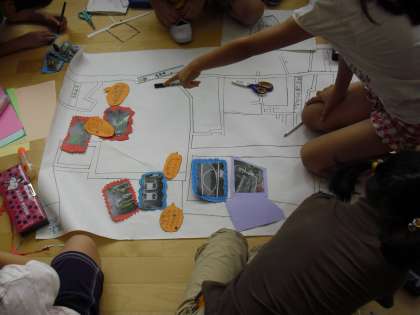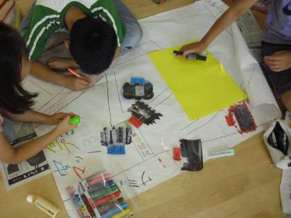 3年生の総合的な学習の時間の授業の様子です。先週でかけたフィールドワークをもとに安全マップを作成しているところです。危険な場所等を表示を工夫しながらわかりやすい地図を作っています。役割を分担しながら進めています。