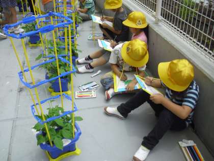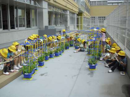 1年生の生活科の授業の様子です。アサガオもずいぶんと大きく生長しました。つるも伸びてきています。テラスに出て、子どもたちは観察カードに生長したアサガオを描いたり、気付いたことを書いたりしています。みんな一生懸命でした。
