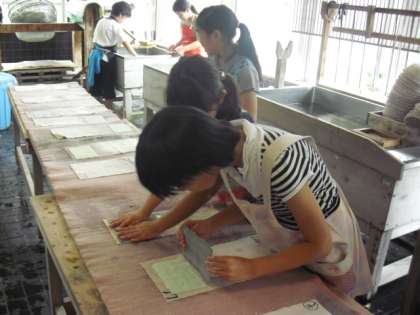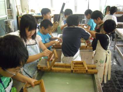 4年生の校外学習、紙すき体験の様子です。山崎小学校にある伝統工芸室で行いました。紙パックのパルプを水に溶かしたものでハガキを作っている様子です。子どもたちは指導員の方の説明をよく聞いて作業を行いました。貴重な体験をしました。