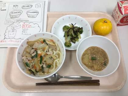 今日は、五目みそうどん、野菜の浅漬け、大根のそぼろ煮、みかん、牛乳です。