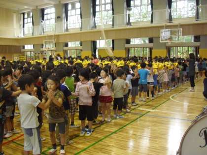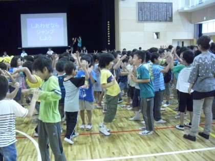後半は器楽委員会の子どもたちが考えた「ハイタッチしよう」「ジャンプしよう」を加え、近くの友達と手を合わせながら楽しく歌いました。体を動かしながら、気持ちのよい朝を迎えることができました。