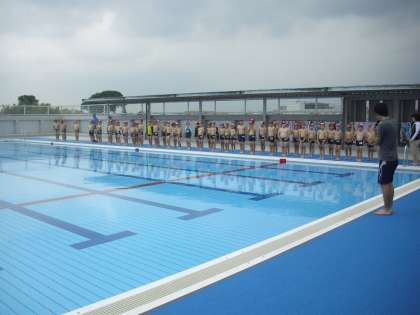 2年生のプール開きの様子です。プールサイドに真っ直ぐ整列した2年生。担任の話をしっかりとした態度で聞いています。楽しいプールの授業をするためには、安全が第一です。約束を守って楽しいプールにします。