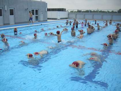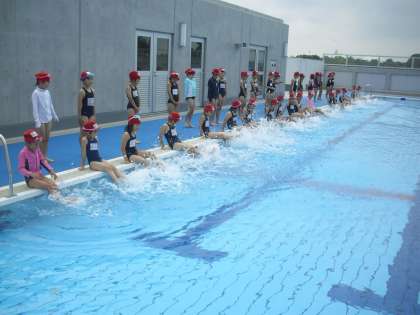 笛の合図でプールに入る準備をします。3つめの笛でプールサイドに座り、ばた足です。水しぶきに子どもたちも大喜びです。プールでは、いろいろな動きを楽しみました。浮いたり、潜ったりして水遊びを楽しみました。