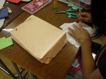 3年生の図画工作の授業の様子です。手作りの紙袋の制作に取り組んでいるところです。袋ができあがり、絵を描いたり、模様を付けたり、色紙で作った飾りを付けたりと工夫しています。一人でいくつも作っている人もいます。