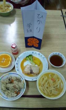 炊き込みご飯、ほうとう、メカジキの照り焼き、茹でブロッコリー、オレンジ、ヤクルト です。