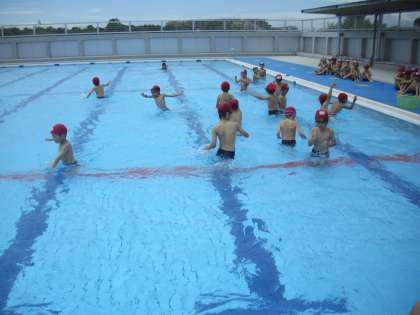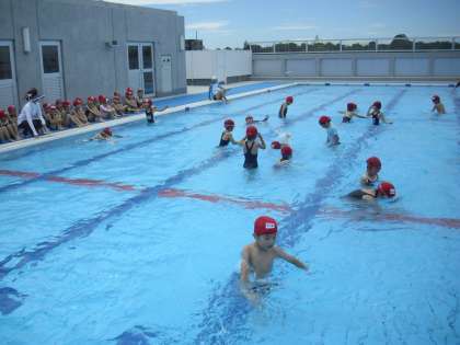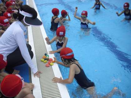 1年生の体育の授業の様子です。プールで楽しく水遊びをしているところです。これは宝探しの様子です。プールの底に沈んでいる宝物を拾い集めます。水の中にもぐってつかみます。一つ取ったら先生のところに持っていきます。「イチ、ニ、サン・・」運動会の玉入れのように数えます。遊びながら水に慣れていきます。
