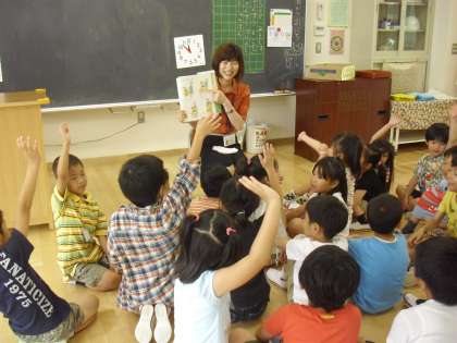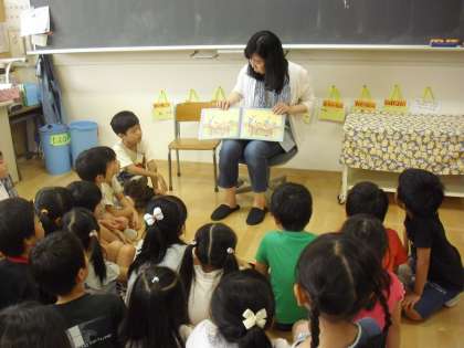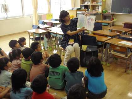 低学年の絵本は、動物が主人公だったり、身近な話題だったり。共感できるもの経験のあるものが多いです。ですからお話の中にすぐに入っていけます。渡部校長も1年生の教室で子どもたちへの読み聞かせを通してふれあっていました。