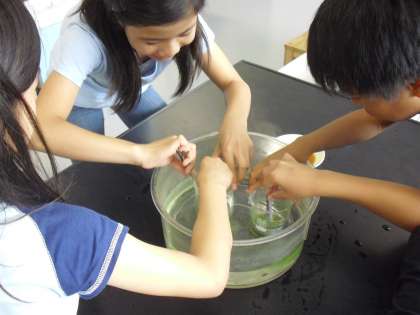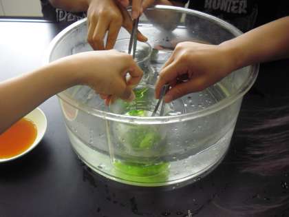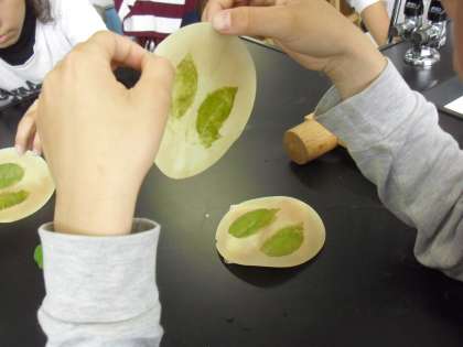 6年生の理科の授業の様子です。植物の葉のでんぷん反応を調べるための実験です。湯で温めたビーカーに葉を入れ、色をぬきます。ろ紙で水分を吸い取って、ヨウ素液ででんぷん反応を確かめます。子どもたちは進んで実験を行っていました。