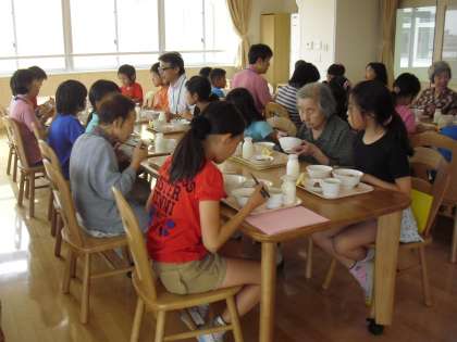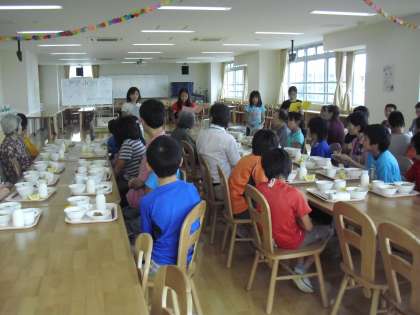 5年生のふれあい給食の様子です。芦花ホームの方をお招きし交流を温めました。まず、多目的室での会食です。この日のために役割を分担し、準備を進めてきました。子どもたちと会話をしながら楽しく会食しました。