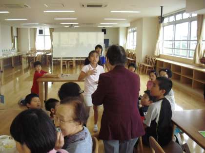 会食の後は、歌や手品でおもてなしをしました。観ていただくだけでなく、参加していただけるように工夫していました。楽しい一時を過ごすことができました。地域の方とのふれあいをこれからも深めていきます。