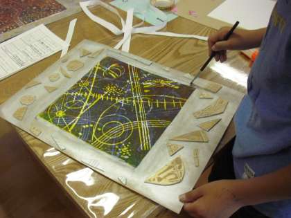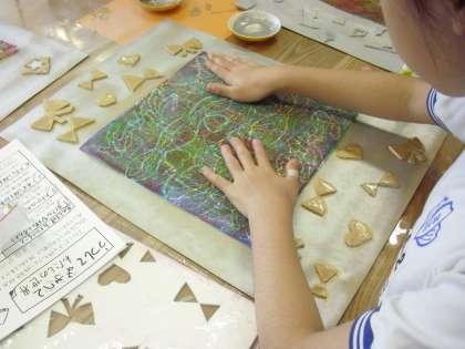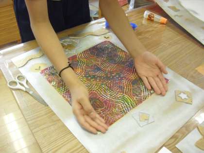 6年生の図画工作の授業の様子です。完成した額に版画をはり付けているところです。額もそれぞれに工夫があり、版画をより一層引き立てています。ていねいに作品づくりに取り組む6年生の作品は、自分らしく表現できています。