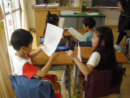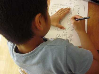 1年生の道徳の授業の様子です。教材「くまさんのなみだ」を通して、友達と仲良く、助け合う大切さを考えました。場面毎に、みんなでくまさんの気持ちを考えていきます。最後にみんなと仲良くなったくまさんの気持ちをワークシートに書き、自分の考えを隣の友達と紹介し合いました。自分の考えを伝える活動を取り入れています。