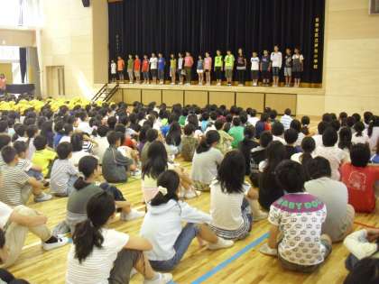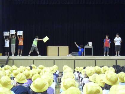 今朝の児童集会の様子です。今回は、図書委員会の発表でした。図書の扱い方、図書室の利用の仕方などを劇にした三択クイズを行い、発表を見ているだけでなく、いっしょに参加する内容でした。
