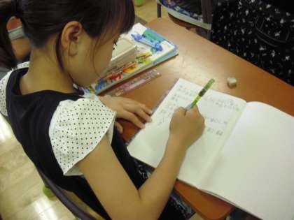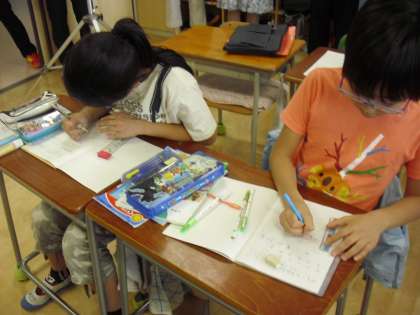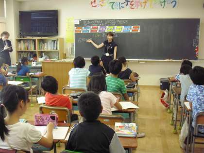 4年生の算数少人数指導の授業の様子です。今年度の校内研究の第1回目の研究授業として行いました。本校は「どの子にも分かる喜びを味わわせる授業の工夫〜仲間とともに高め合う算数〜」と研究主題を設定し、授業力向上と授業改善に向けた取り組みを行っています。4年生の単元「2けたでわるわり算」の学習です。学習課題をつかみやすくするために、10のまとまりを提示し、見通しをもちやすくしました。80枚の色紙を、一人に20枚ずつ分けると何人に分けることができるか、その考え方を各自がノートに図や式を使って書いているところです。