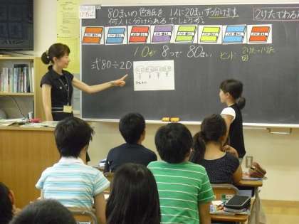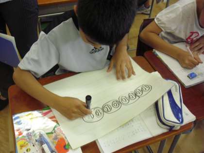 考えがまとまった人は、ノートに書いた内容をボードに大きく書き、発表します。考えを共有する学習活動です。自分と同じ考えの人もいれば、同じことでも書き表し方が異なる場合もあります。出された考え方の共通点を見付けていきます。「10のまとまりで考えればよい」「これまで学習してきた方法で計算することができる」ことをみんなで確認しました。