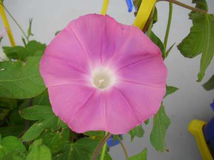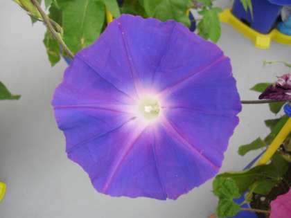 1年生のテラスに並んだアサガオの鉢植え。毎日、お水をあげてお世話をしています。花も咲き出した鉢植えが増えてきました。きれいな色の花を咲かせています。