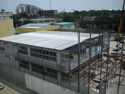 本日の仮設校舎解体工事の様子です。小学校の中央部分は1階の床が見え、校庭のクレーン車もはっきりと確認できます。解体のスピードは予想以上に速いです。一日ごとに姿を変えていきます。