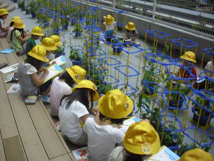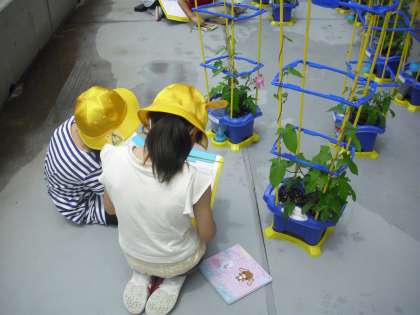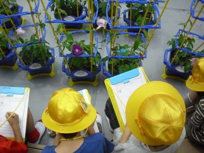 1年生の生活科の授業の様子です。テラスに出て、アサガオの観察をしているところです。花を咲かせている子も多く、観察カードには水色やむらさき色の花を描いていました。咲いた花の数を数えるのも楽しみです。