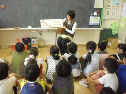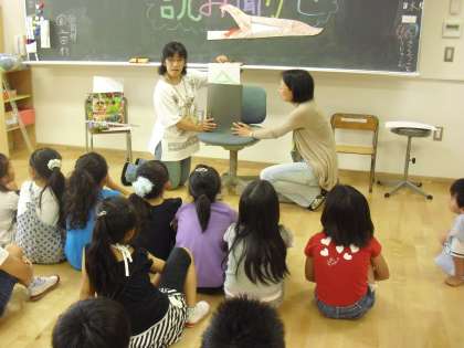 読み聞かせは、読み手と聞き手の交流の場でもあります。あるクラスでは、漢字を当てるクイズをおこなっていました。漢字の一部を見せて子どもたちは予想します。少しずつ見える部分を広げていくと、予想がだんだん変化していきます。読み手と聞き手のかかわり合いを深める場でもあります。