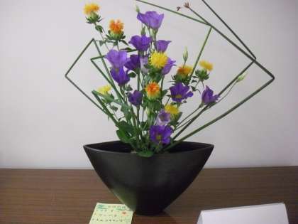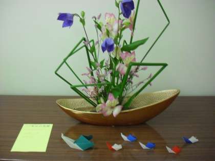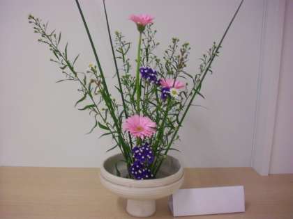 中学校の部活動「生け花部」の作品です。自分たちが生けた花を、校内に展示します。もちろん、小学校にも飾ってくれます。作品を作った人の名前と、使った花の名前が添えてあります。心が静まります。