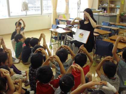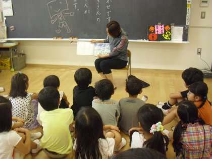 読み聞かせをはじめる前に、保護者の方といっしょに手遊びをしているクラスもありました。子どもたちとの交流を深める時間にもなっています。読み聞かせを通して、たくさんの保護者の方々とのふれあいをはぐくんでほしいと願います。