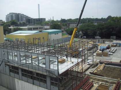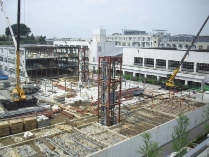 本日の仮設校舎解体工事の様子です。残っていた屋根の解体もずいぶんと進みました。校庭には資材を積んだトラックも確認できます。種類ごとに並べられた資材の数が増えました。工事が順調に進んでいます。