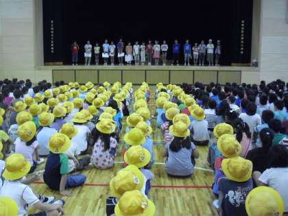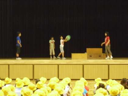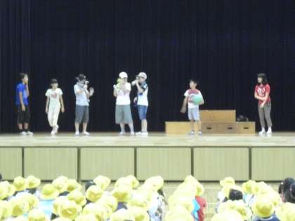 今朝の児童集会の様子です。今回は保健委員会の発表です。熱中症予防をテーマに劇とクイズでみんなに呼びかけました。クイズは三択で、みんなも参加できるように考えた内容です。