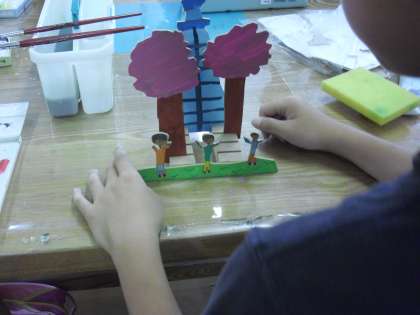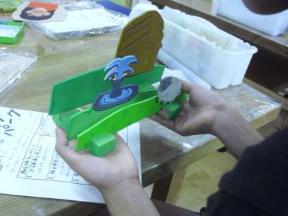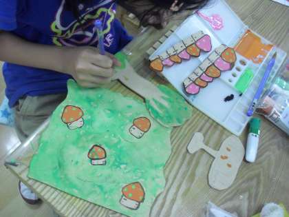 5年生の図画工作の授業の様子です。木工作「ズラシックパーク」の制作に取り組んでいるところです。自分が考えた形を電動糸のこで切り取って、絵の具で色を付け、パーツをずらしておいていくと、遠近感のある作品になります。
