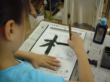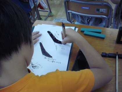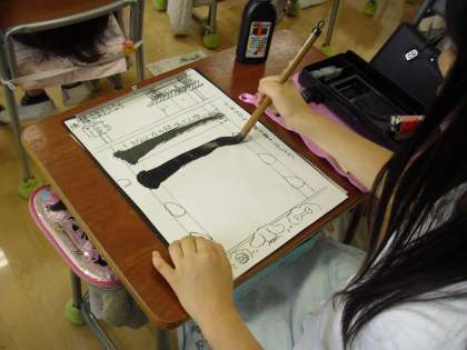 4年生の習字の授業の様子です。課題文字は「林」です。はじめから文字を書くのではなく、部分部分の練習をしてから書きます。まず、横の線です。しっかり止めます。そしてはらいです。一画一画大切にして書きました。