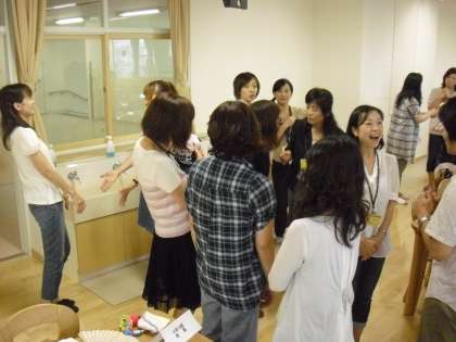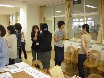 時間内にできるだけ多くの人とかかわります。出会った人と両手でハイタッチしてジャンケンです。勝った人は相手に質問をします。質問をきっかけに会話も弾みます。和やかな雰囲気のなか、新しい知り合いができたり、初めて会話を交わしたりしながらかかわりを広げることができました。