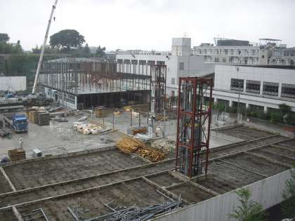 本日の仮設校舎解体工事の様子です。小学校部分は2階部分の解体がほぼ終わりそうです。階段がクレーンで運ばれています。中学校部分も残すは1階の屋根となってきました。今日は、七夕です。あいにくの雨ですが、安全に工事が進むことを願っています。