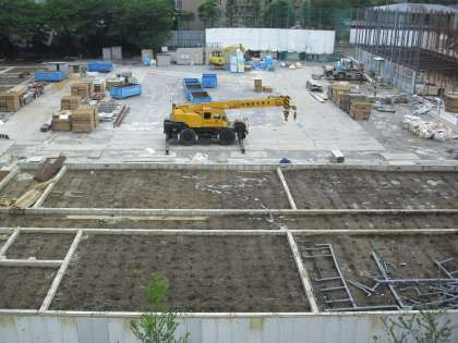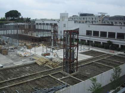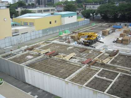 今日は工事はお休みです。小学校校舎は鉄柱がすべて外され、地面に敷いていた厚い板も取り外されています。2階部分は中学校校舎の一部を残すのみとなりました。小中学校のピロティだった跡がよくわかります。
