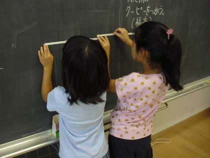 2年生の算数少人数指導の授業の様子です。長さの学習に取り組んでいるところです。定規代わりの工作用紙の1センチマスを活用して、身近なものの長さを測っています。いろいろな長さを測るなかで理解を深めていきます。