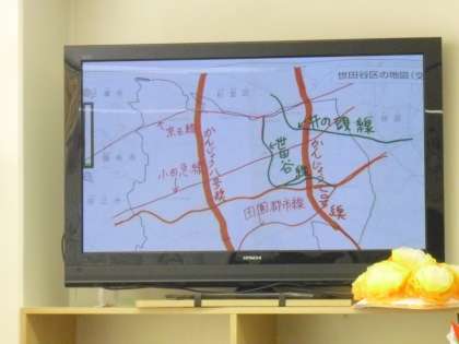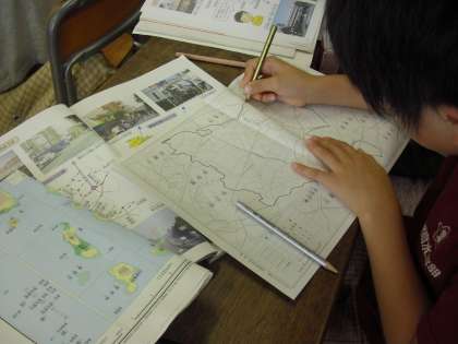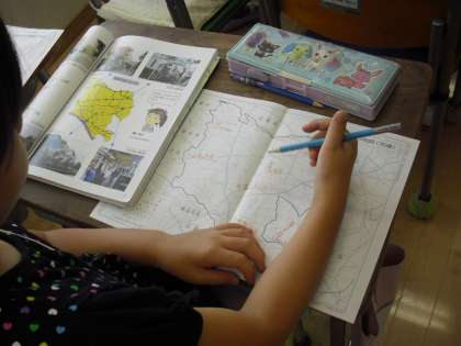 3年生の社会の授業の様子です。3年生では、自分たちの地域である世田谷区の学習に取り組んでいきます。今日は、白地図を使って、芦花小の位置や環状8号線の位置を確認しているところです。