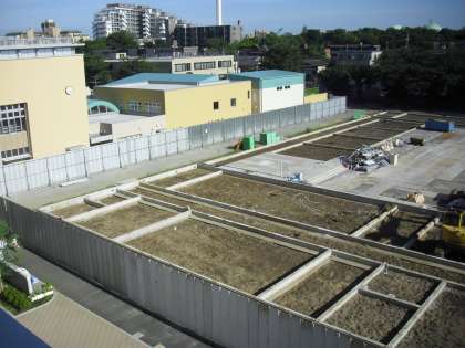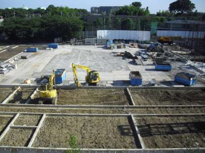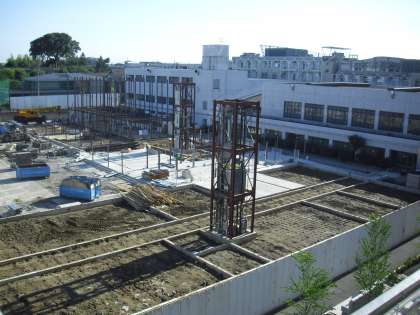 解体され、校庭に積んであった資材も運ばれ、ずいぶんと校庭がすっきりしています。中学校校舎も天井が外され、鉄柱だけの状態です。2本のエレベーターがそびえ立って見えます。