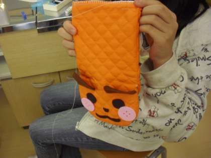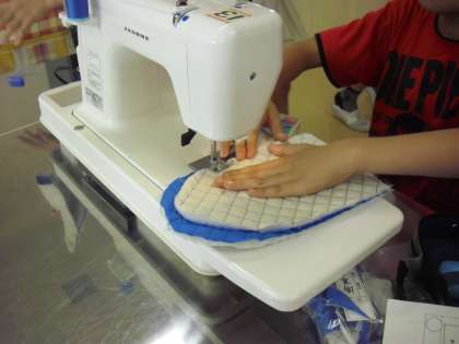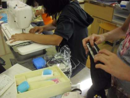 6年生の家庭科の授業の様子です。「なべつかみ」の製作に取り組んでいるところです。ミシンや針と糸を使いながら、ていねいに仕上げていきます。つかむ部分を動物の顔に見立てた作品もあります。