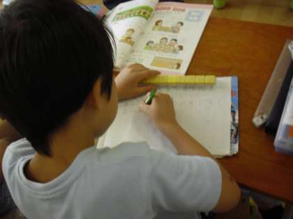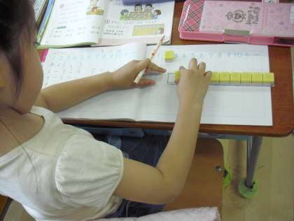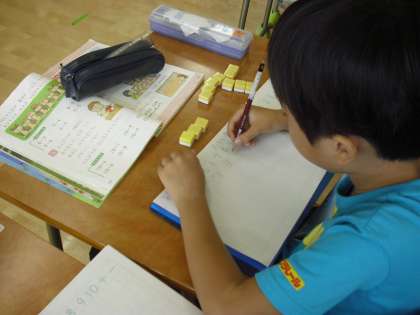 1年生の算数の授業の様子です。たしざんの学習に取り組んでいるところです。ノートに式を書いて、計算します。答えはブロックを使いながら確かめます。具体物の操作をすることで数への理解が深まります。