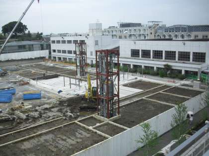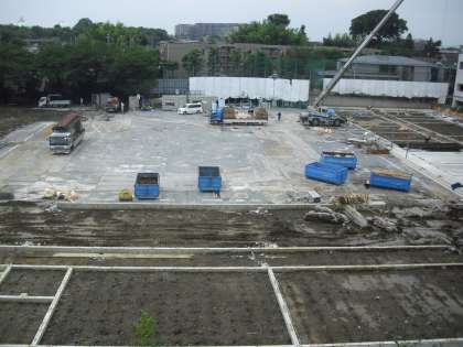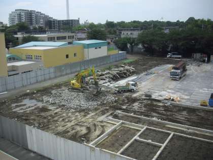 本日の仮設校舎解体工事の様子です。第2昇降口の砕かれたコンクリートが積まれています。小中学校のピロティの周辺も重機による工事が始まりました。校庭に並べられていた資材もトラックに積まれ運ばれていきます。