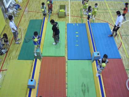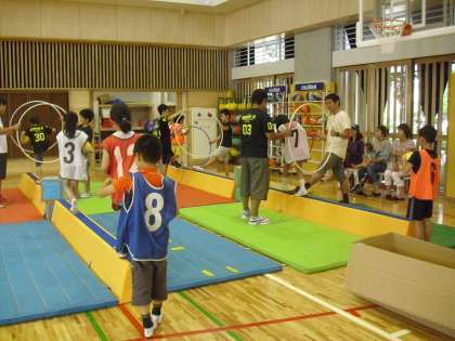 スポーツ教室は4つの場に分かれて、ローテーション形式で全部の運動の場を体験します。これは、平均台を使った場です。バランス感覚を養う運動を中心に行いました。ボールを持ちながら歩いたり、フラフープをくぐったりします。小学校では、多様な動きを経験することが大切です。