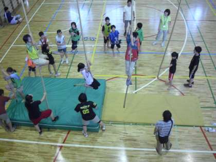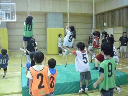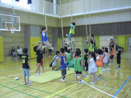 これは、のぼり綱を使った運動の場です。文字通り、綱をのぼっていきます。握る力、腕の力脚の力を総合的に活用します。子どもたちにとっては、のぼる運動は場がなけれななかなか経験できない運動です。何度もチャレンジしました。