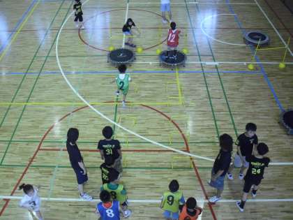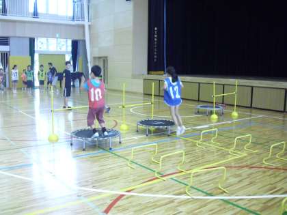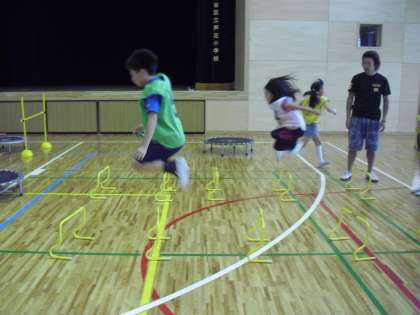 フレキシブルハードルとトランポリンを組み合わせた場です。瞬発力や調整力を養う運動を行います。ハードルを両足ジャンプでリズミカルに跳びこえ最後はトランポリンでバーを跳びこえます。空中でバランスをとるところがポイントです。