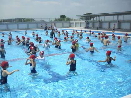 1年生のプールの授業の様子です。1年生も久しぶりのプールに大喜びです。水を掛け合ったり、ダンスをしたり楽しく水遊びをしました。後半は、夏休みの水泳教室に向けての検定を行いました。