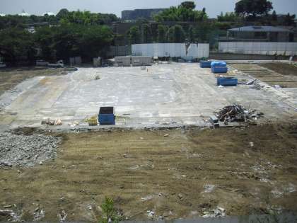 本日の仮説校舎解体工事の様子です。元小学校校舎の第1昇降口、第2昇降口のところで重機がコンクリートを細かく砕いて集めています。だんだんと資材がなくなり、校庭の広さが見えてきました。